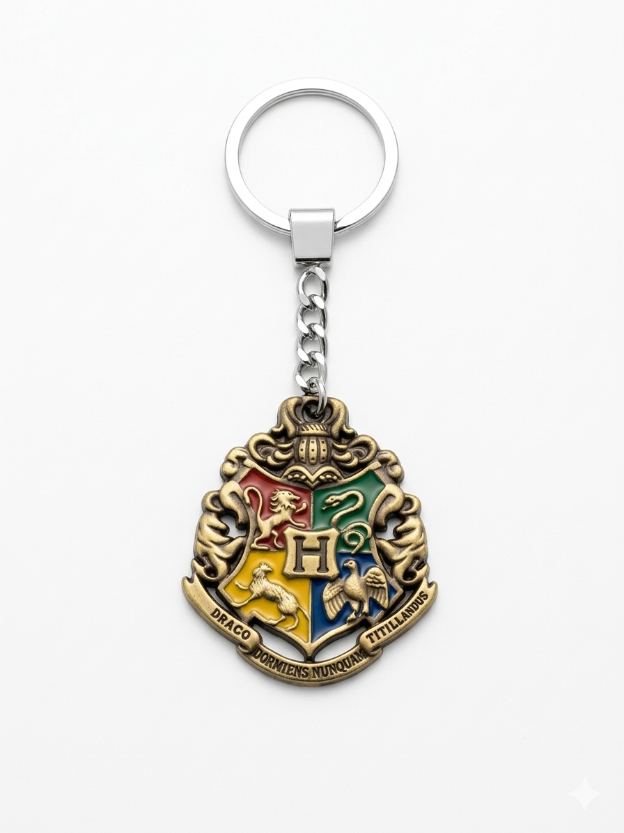 high colored metal pewter key chain/key ring that features the Hogwarts School of Witchcraft and Wizardry crest logo as depicted in the books and seen in the Harry Potter movies.